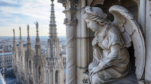 Obraz premium From the edge of a rooftop an intricately carved stone angel watches over the Gothic cathedral below its wings stretched wide in protection.