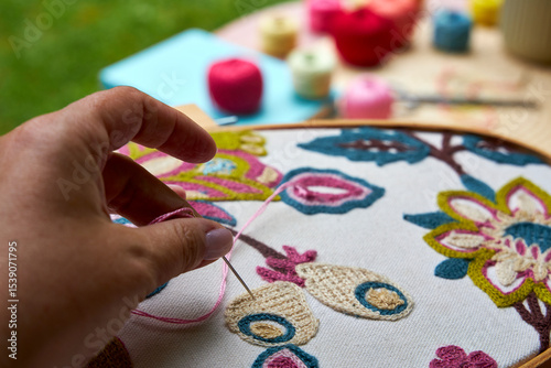 Fototapeta premium Front close-up view of a woman's hands embroidering a decorative pattern on...