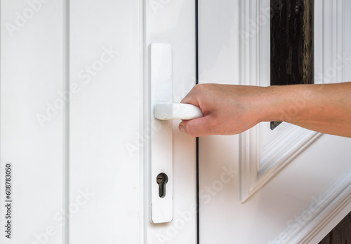 © mirsad, Fototapeta premium front door. hand holds doorknob on front door PVC