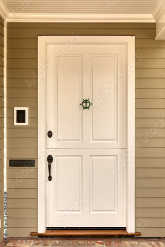 Fototapeta premium Front door, white front door with a door knocker.