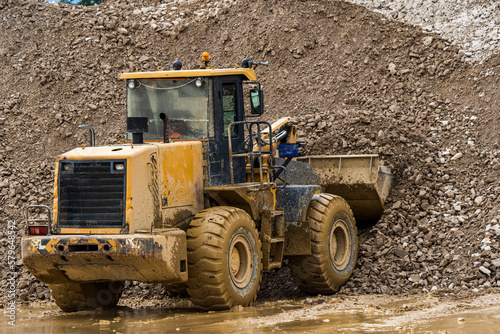© suvorovalex, Obraz premium Front end loader dumping stone and sand in a mining quarry