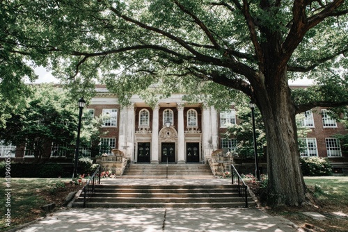 © Ayam, Naklejka premium Front facade of a classic school building, shaded by a large tree