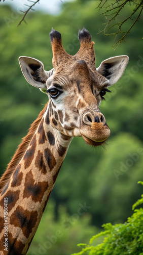 © Khaleda, Fototapeta premium Front Facing Giraffe Portrait with Brown Spots and Green Background