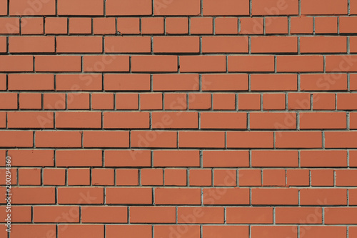 Fototapeta premium Front full-size view of a flat brick wall. Bricks are of light brown / dark orange color. Bricks protrude slightly.