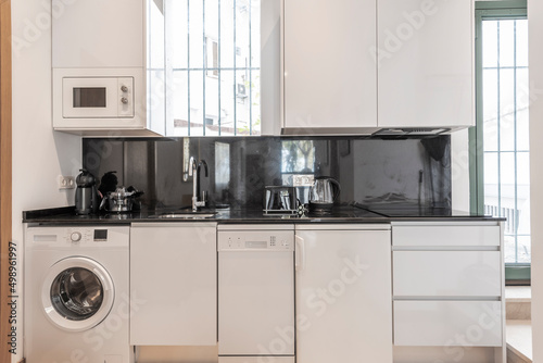 © Toyakisfoto.photos, Fototapeta premium Front image of an open kitchen with a black marble countertop with small appliances, a four-burner ceramic hob, gray furniture and access to the terrace with an aluminum and glass door