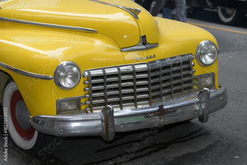 Fototapeta premium front of a yellow vintage vehicle at a film set on Bay St, Toronto