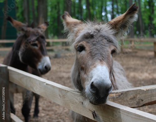 © Ruslan, Fototapeta premium Front of Horse or donkey in the farm. Head of brown Horse or donkey in the stall. Horse or donkey wait grass from traveler.