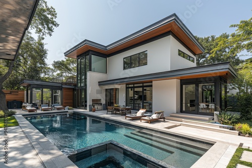 © JIALU, Fototapeta premium Front porch with wood deck and view of backyard garden, grey modern home with oversized sliding door, small pond, and wooden chairs in Seattle.