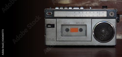 © nonneestudio, Fototapeta premium front view antique black and silver radio on wooden background,copy space
