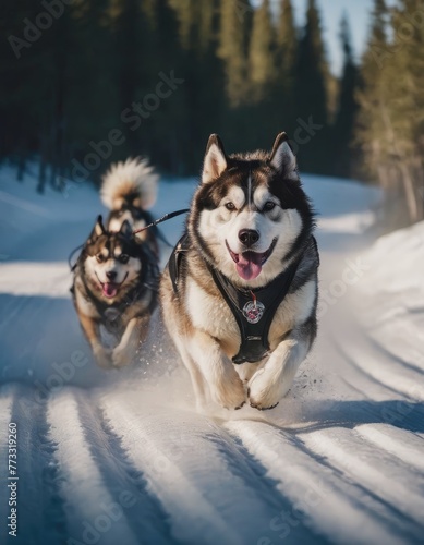 Fototapeta premium front view at four siberian huskys at race in winter