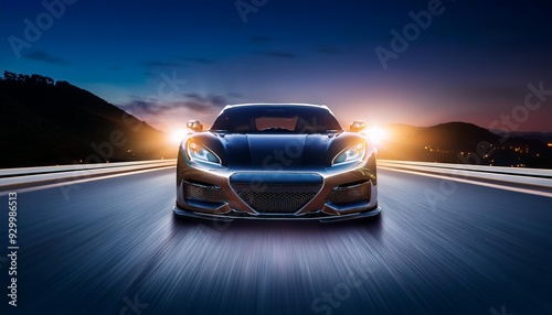 Fototapeta premium Front view close up headlamp light at night of a luxury sports car riding on...