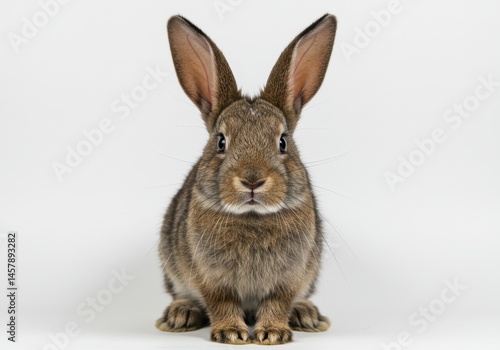 © Vooglo.com, Fototapeta premium Front view of a brown rabbit sitting upright on a white background