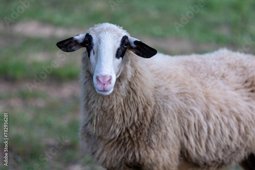 Naklejka premium Front view of a domestic sheep with fluffy fur, and black ears, on a grassy field on a farm