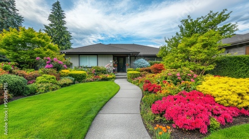 Naklejka premium Front view of a house with a well-kept garden and a sleek concrete walkway, surrounded by vibrant flowers and greenery.