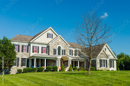 © kosoff, Obraz premium Front view of a large country house. Large freshly cut lawn and trees in the foreground.