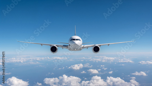 Fototapeta premium Front view of a modern commercial airplane flying high above fluffy clouds in a clear blue sky