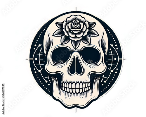 Fototapeta premium Front view of a natural human skull, with black and white detailed illustration