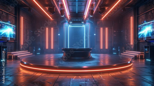 © DARIKA, Obraz premium Front view of a stage podium with editable podium angles and digital display screens. , Minimalism,