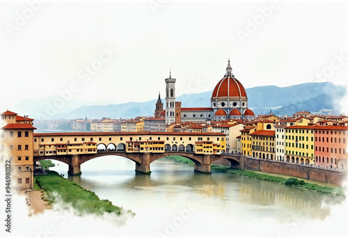 © W2GO, Naklejka premium Front view of aesthetic Florence landscape illustration or cartoon