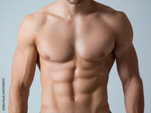 © ECLIVN, Fototapeta premium Front View of an Athletic Mans Bare Torso Showcasing Well-defined Abdominal Muscles and Strong Biceps Against a Minimal Light Background