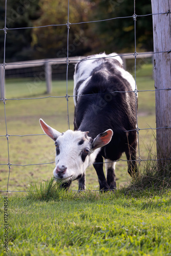 © Annette Buchkowski, Fototapeta premium Front view of black and white domestic goat Capra hircus stretching its neck through a wire fence to reach some succulent grass on the other side