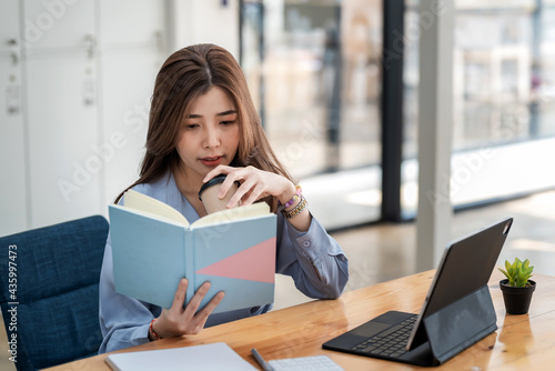© amnaj, Obraz premium Front view of businesswoman sitting at the office drinking coffee reading the tablet is placed at the office table.