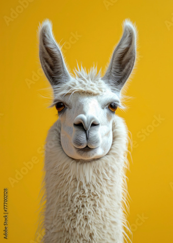 © Instacraft.Studio, Obraz premium Front view of headshot of cute llama having white fur, isolated yellow background