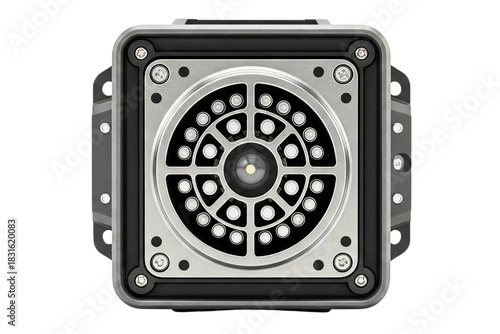 © tnihousestudio, Fototapeta premium Front view of industrial camera sensor with an LED ring light on a transparent background