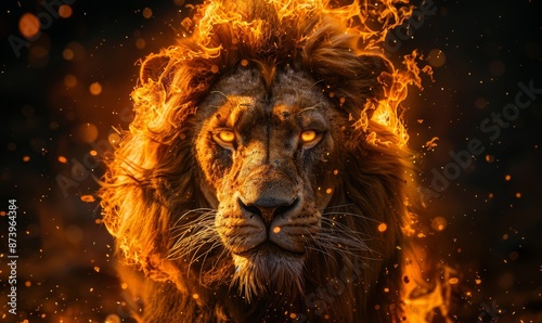Naklejka premium front view of Lion king in fire, Portrait on black background