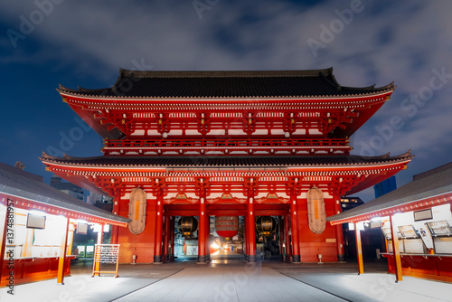 © Itza, Fototapeta premium Front view of the Hozomon Gate at Senso-ji Temple in Asakusa, Tokyo, Japan, beautifully lit and empty during nighttime.