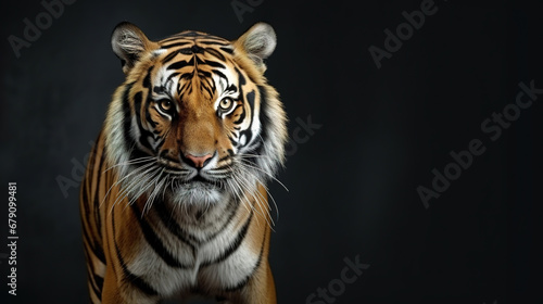 © Uwe, Obraz premium Front view of tiger on dark gray background. Wild animals banner with copy space