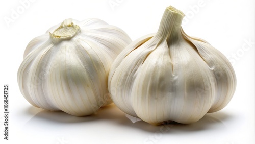 © Wanlop, Obraz premium Front View of Two White Peeled Garlic Cloves Isolated on a White Background Perfect for Culinary Uses, Cooking Illustrations, and Food Photography with Clipping Path
