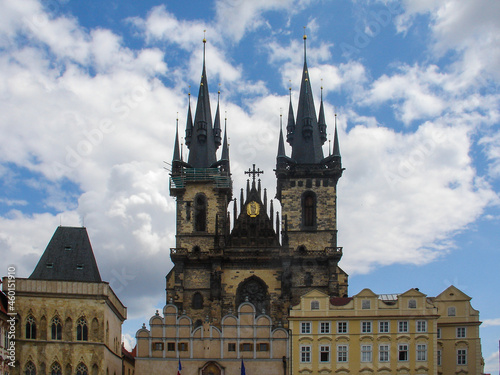 © JaviMinguez, Fototapeta premium Front view of Tyn church from the Old Town Square in Prague