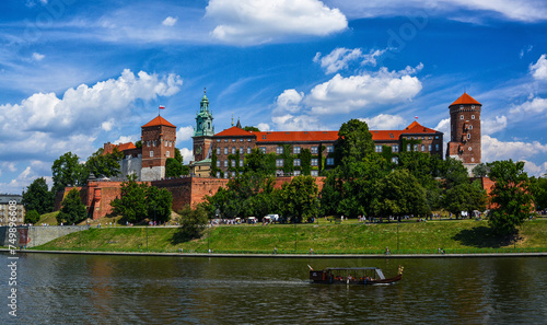 © Daniel Turbasa, Naklejka premium Front view of Wawel castle in Krakow, Poland with boats on Vistula river at summer time.