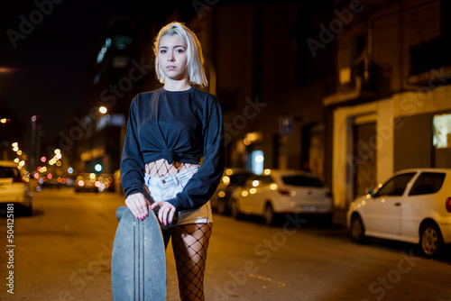 Fototapeta premium Front view of young pretty woman looking camera in shorts while standing on the street holding a skateboard at night in the city