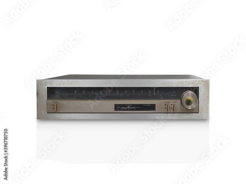 © nonneestudio, Obraz premium front view old silver stereo tuner on white background, object, technology, copy space
