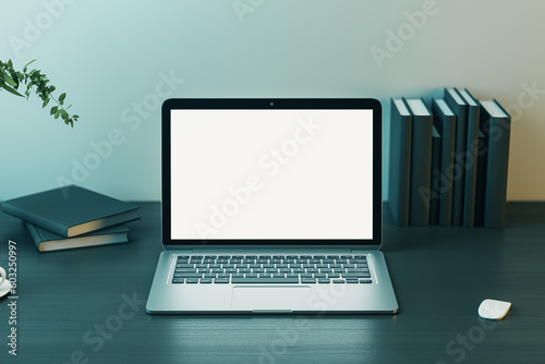 © Who is Danny, Fototapeta premium Front view on blank white modern laptop screen with place for web design, site or landing page on wooden table with black cover books and computer mouse on light wall background. 3D rendering, mockup