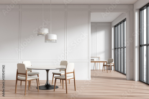 © ImageFlow, Fototapeta premium Front view on bright dining room interior with armchairs, table