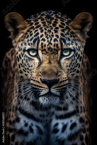 © Delphotostock, Naklejka premium Front view portrait of a leopard on black background, Africa wildlife