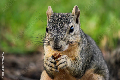 Obraz premium Front view Squirrel close up holding a nut by it's face