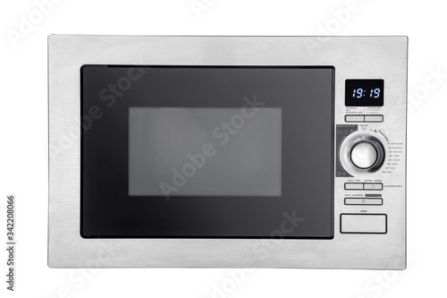 © Rafael, Fototapeta premium Front views and perspective of the home microwave with the door open and closed.