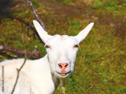 © MACANA, Obraz premium Frontal closeup of a hornless white goat looking directly at the camera