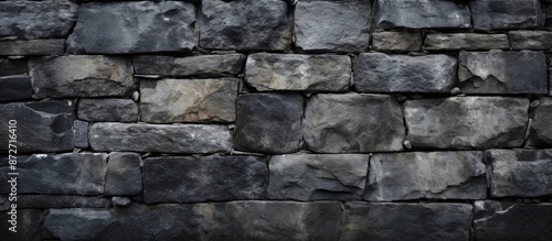 Fototapeta premium Frontal view of a dark stone wall texture with an aged, cracked, and grungy appearance, providing a background with empty copy space image.