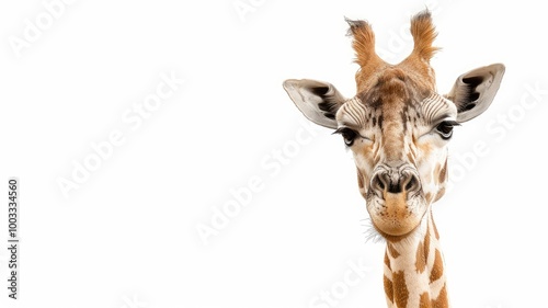 © Artyom, Fototapeta premium Frontal view of giraffe head against white background, looking at camera