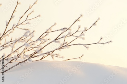 Obraz premium Frost-covered branches gracefully arch over a pristine snowdrift under a soft, warm light.