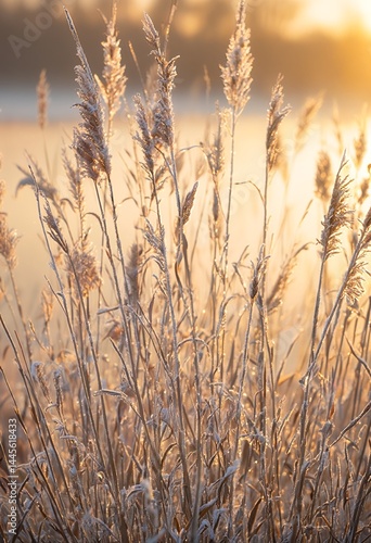 © KarpenArt Studio, Obraz premium frost-covered cattails shimmer in the golden light of a winter sunrise.