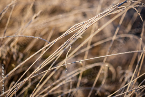 © Martins Vanags, Fototapeta premium frost covered grass and tree leaves in sunny winter morning light