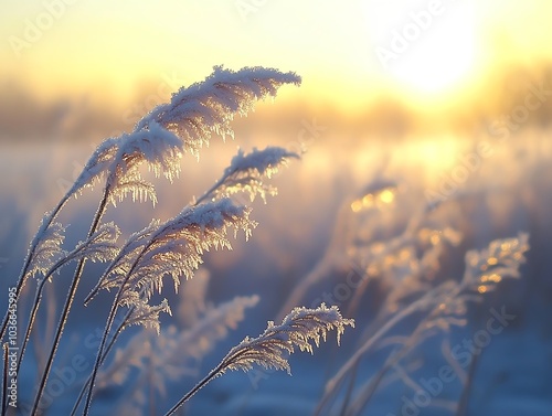 © Thanawin, Obraz premium Frost-covered grass illuminated by sunrise, creating a serene winter landscape.