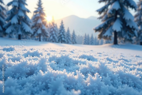 © Jameo, Fototapeta premium Frost-covered ground with hoarfrost crystals and trees in the background, scenery, snowy, landscape