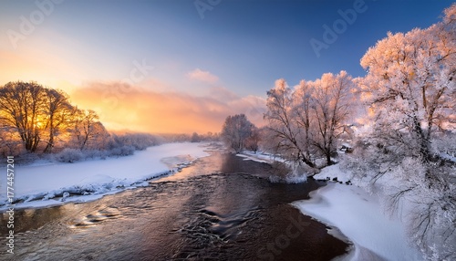 Naklejka premium Frost Covered Trees Line A Gently Flowing River As The Sun Sets Casting Warm Colors Over The Snowy Terrain A Serene Winter Scene Unfolds In This Peaceful Nature Setting